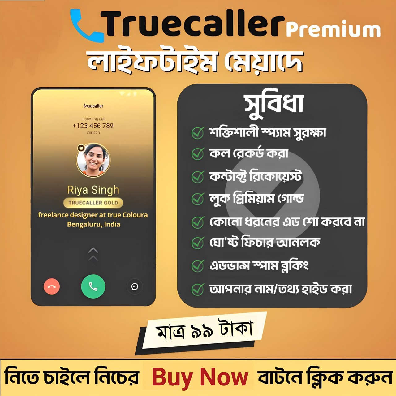 [ Note: Buy Now বাটনে ক্লিক করুন তারপর আপনার সঠিক জিমেইল এড্রেস টি দিয়ে একটু নিচে Proceed To Checkout এ ক্লিক করে যেকোনো একটি পেমেন্ট মেথড সিলেক্ট করে পেমেন্ট করুন। পেমেন্ট কমপ্লিট হলে অটোমেটিক TrueCaller Gold Premium অ্যাপসটি আপনার জিমেইলে পেয়ে যাবেন জিমেইল থেকে আপনি যে কোনো সময় ডাউনলোড করে ইন্সটল করে ব্যাবহার করতে পারবেন। আগে থেকে True Caller ইনেস্টল করা থাকলে আনইনেস্টল করে নিন আইফোনের জন্য কেউ পেমেন্ট করবেন না ৷ এটা শুধু মাত্র Android ফোনের জন্য ]